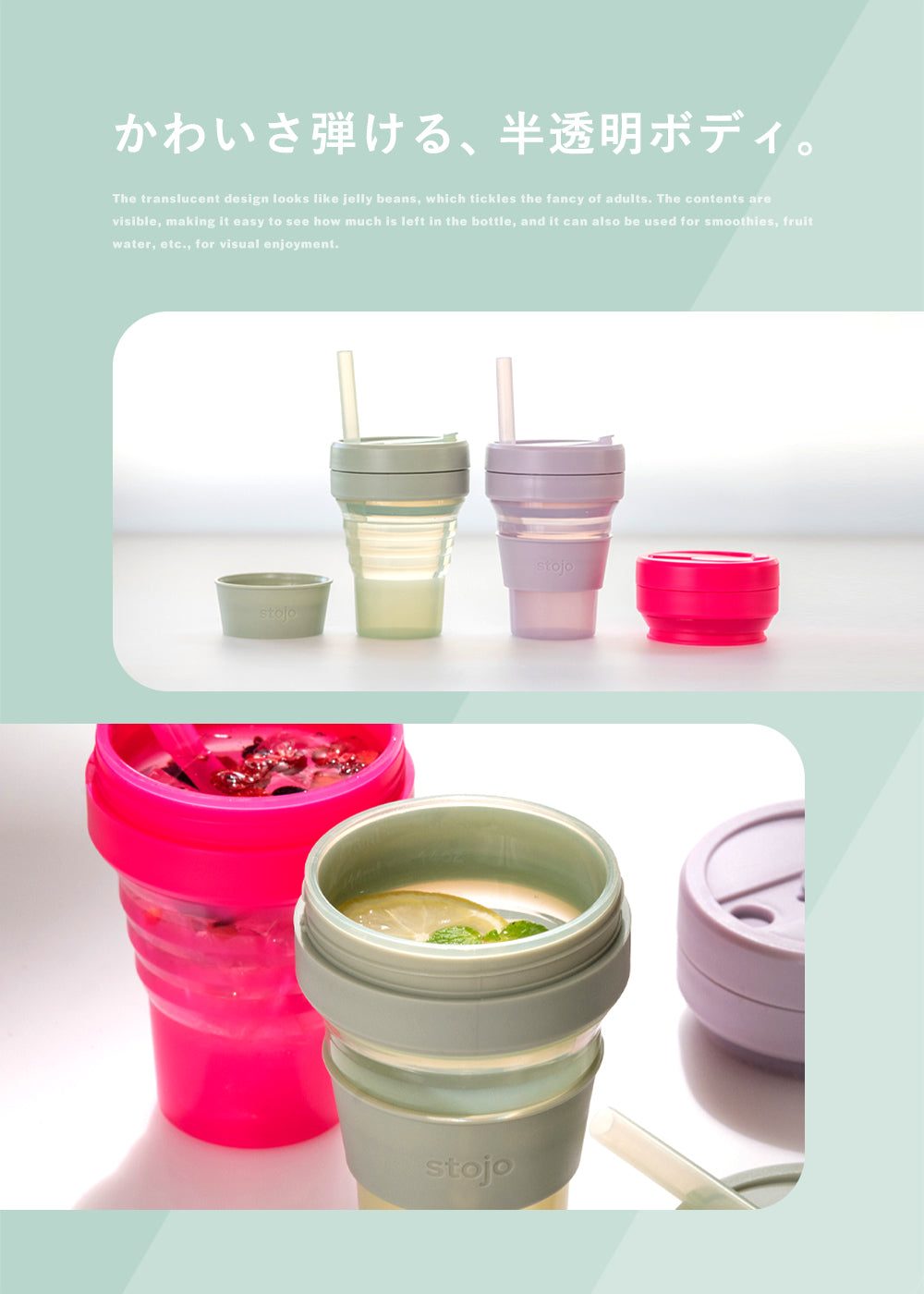 携帯に便利な折りたたみ式、漏れにくい設計など、エコなだけでなく機能面でも優れた特徴があることもstojoの魅力の一つです。